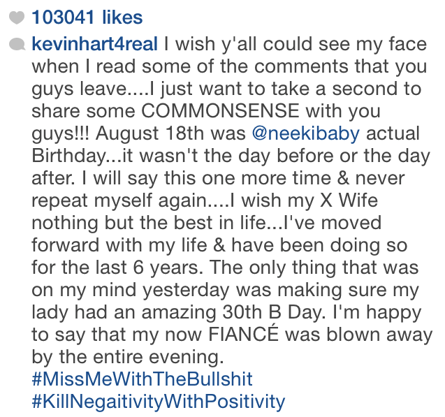Uncategorized August 20, 2014, 14 CommentsActor/comedian Kevin Hart proposed to his girlfriend Eniko Parrish on Monday night just as his ex-wife Torrei Hart’s reality show ‘Atlanta Exes’ premiered on VH1. When fans accused Kevin of proposing the same night just to steal Torrei’s shine, he lashed out on social media. See what he wrote on instagram after the cut…